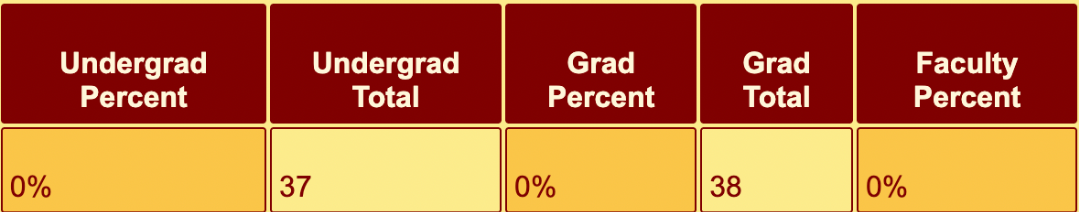 The smallest ethnic group in all categories are Native Americans making up 0% in all categories. There is a total of 37 Native American undergraduate students, 38 graduate, and 9 faculty members. Though slightly higher, the Hawaiian and Pacific Islander population is nearly identical and also at 0%.