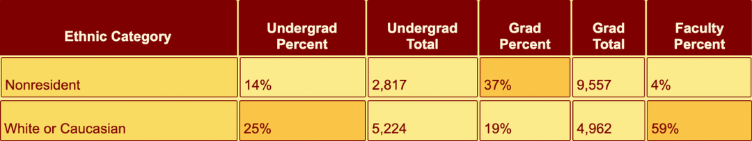 The largest Ethnic group for undergraduate students was white making up 25%, International for graduate students with 37%, and white for faculty with 59%.