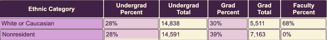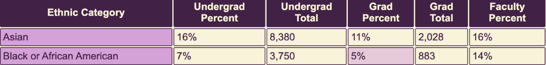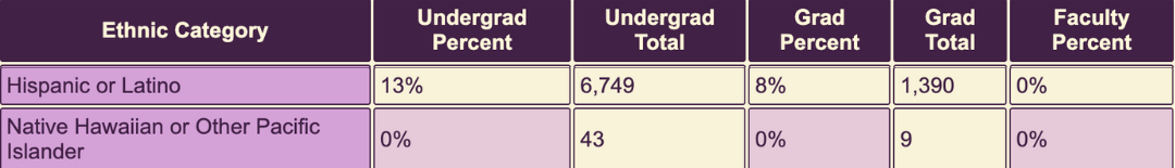 Ethnic Category Undergrad Percent Undergrad Total Grad Percent Grad Total Faculty Percent Faculty Total
